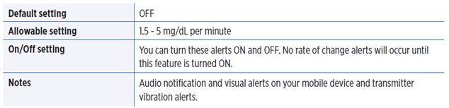 The Rate of Change Alerts let you know when your glucose level is falling or rising faster than the Rate Alert setting you choose.