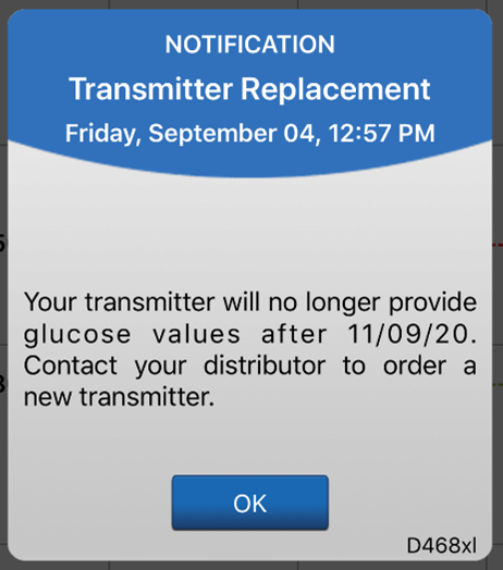 The system will send out a notification on day 330, and alerts on days 366, 395, and 396 reminding the user to order a new smart transmitter. After day 395, the smart transmitter will no longer be able to provide CGM data to you.